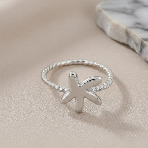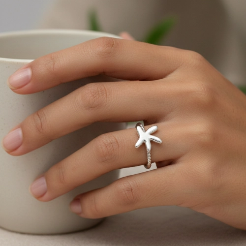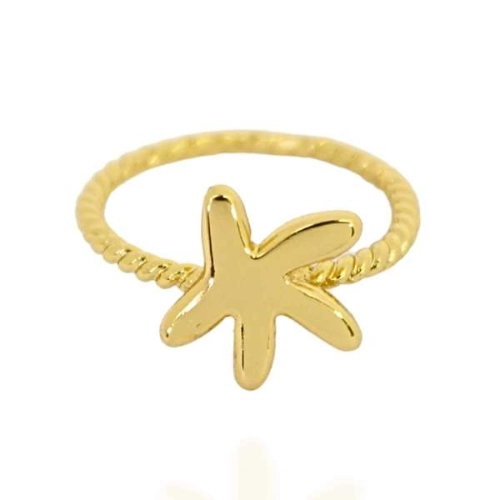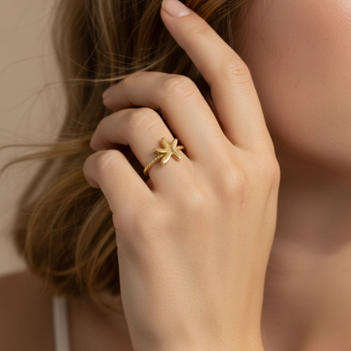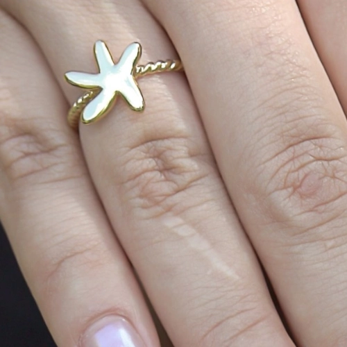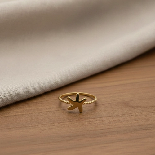 Anel banhado a ouro 18K ou ródio branco, aro torcido, com detalhe central em formato de estrela-do-mar, acabamento polido e design moderno e sofisticado, perfeito para quem busca um acessório diferenciado e cheio de personalidade para complementar qualquer look.