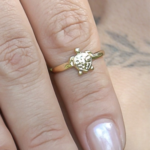 Anel banhado a ouro 18K, aro liso, com detalhe central em formato de tartaruga, acabamento polido e design delicado e sofisticado, ideal para quem busca um acessório exclusivo e versátil para valorizar qualquer look.