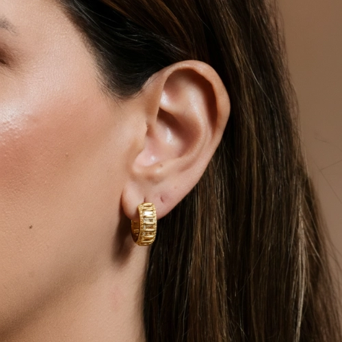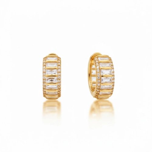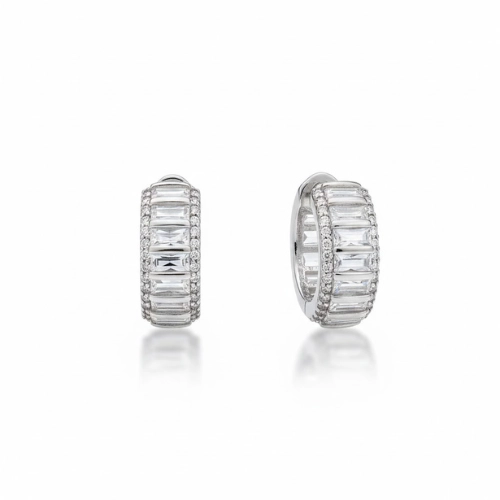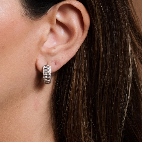 Brinco banhado a ouro 18k ou ródio branco, modelo argola pequena em formato navete, com cravação central de zircônias retangulares e bordas microcravejadas. Possui acabamento polido de alto brilho, sendo a escolha ideal para quem busca uma semijoia clássica e sofisticada que valoriza o visual com elegância e brilho intenso.
