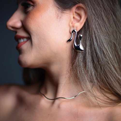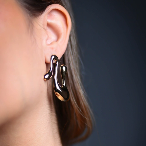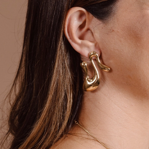Brinco banhado a ouro 18k e ródio branco, modelo grande com design orgânico e fluido, sem cravação para destacar o brilho liso do metal. Com acabamento polido de alta qualidade, é a escolha ideal para quem deseja uma peça artística e contemporânea que eleva o visual com elegância única.