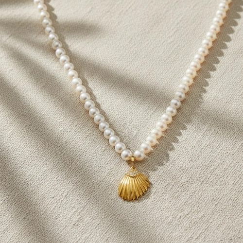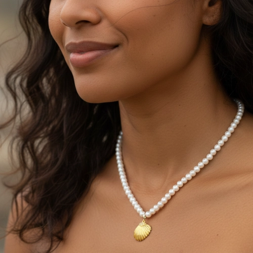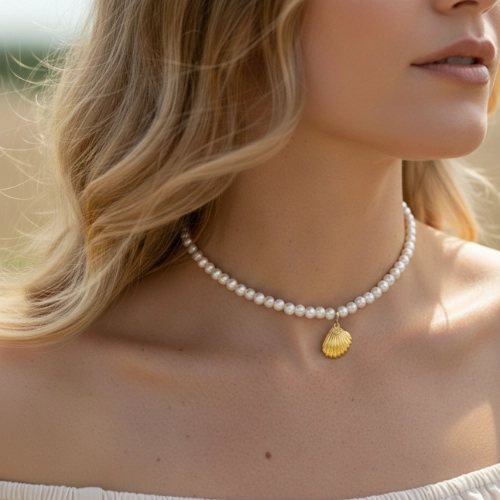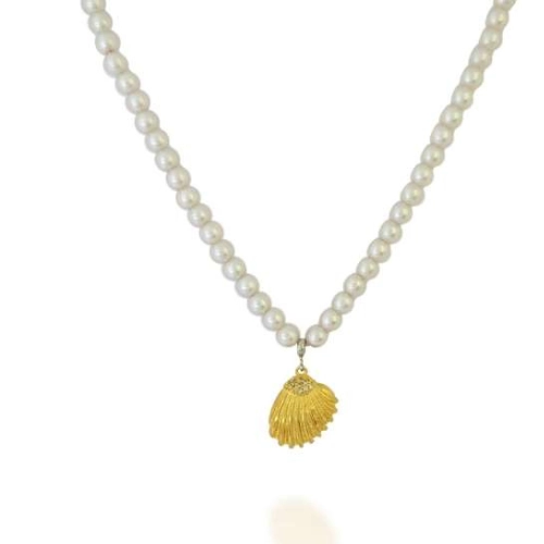 Choker com pérolas, com detalhe central banhado a ouro, em formato de concha texturizada, cravejado com zircônias, em acabamento polido, com visual sofisticado, ideal para complementar looks elegantes e modernos.