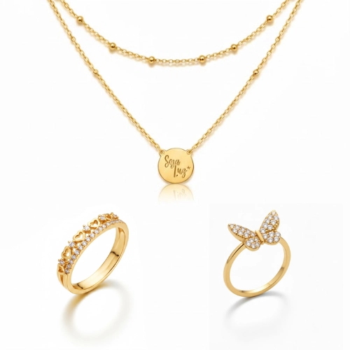 Sofisticado conjunto de colar e anéis banhado em ouro 18K e ródio branco, com um colar duplo de corrente veneziana e bolinhas com pingente de medalha lisa com “Seja Luz” gravado, e dois anéis cravejados em zircônias, um em formato de borboleta e outro em formato de aliança com detalhes cravejado e de corações vazados, perfeito para quem busca um mix moderno e delicado para valorizar qualquer produção.